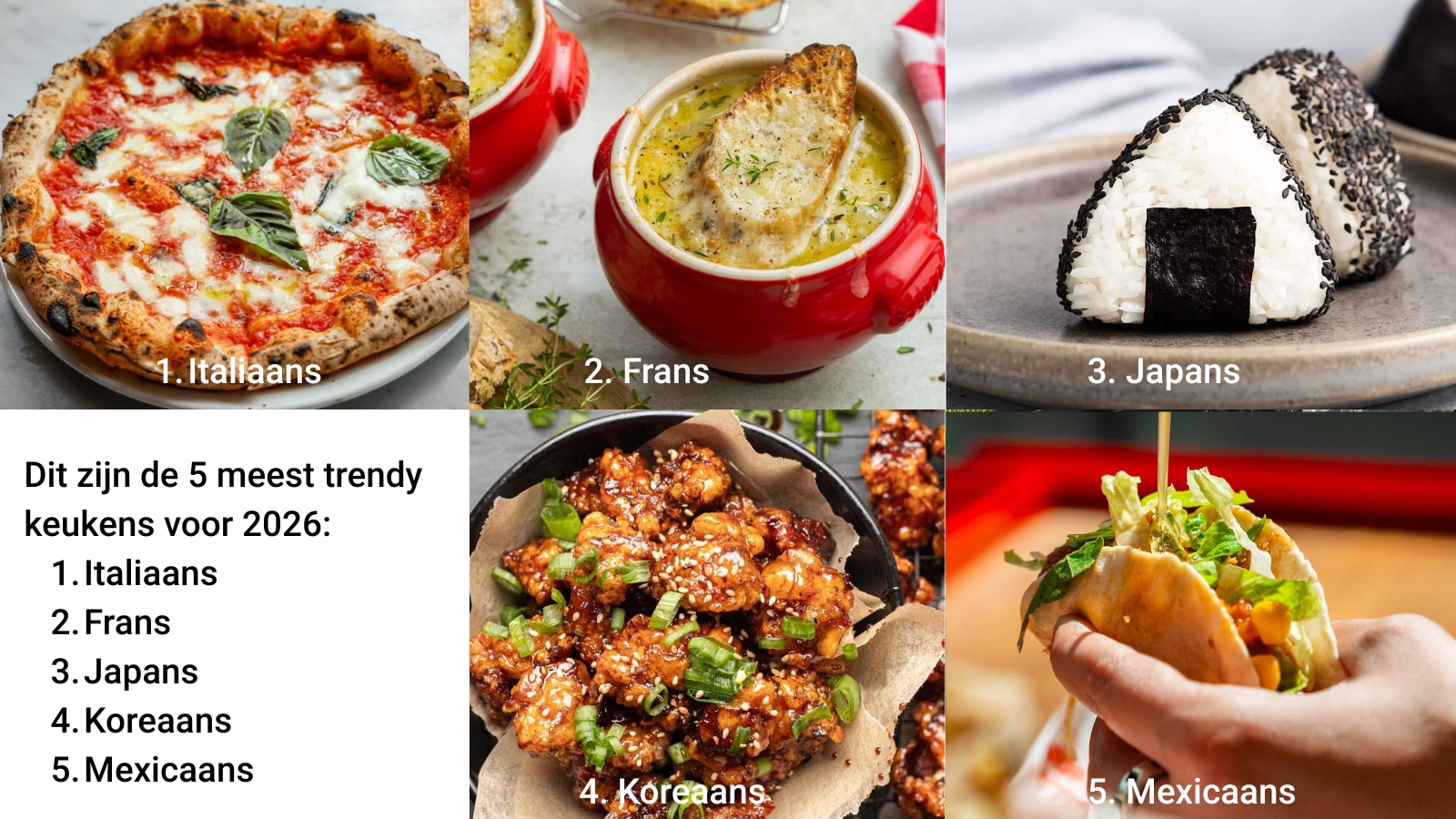 De wereld wordt steeds internationaler, en wat we eten ook. Met name jonge mensen willen daarom ook in Nederland genieten van 'klassieke' wereldsmaken die ze leren kennen op reis of via hun telefoon. Welke wereldkeukens zijn op dit moment het meest trendy? Food Inspiration zet er 5 op een rij.