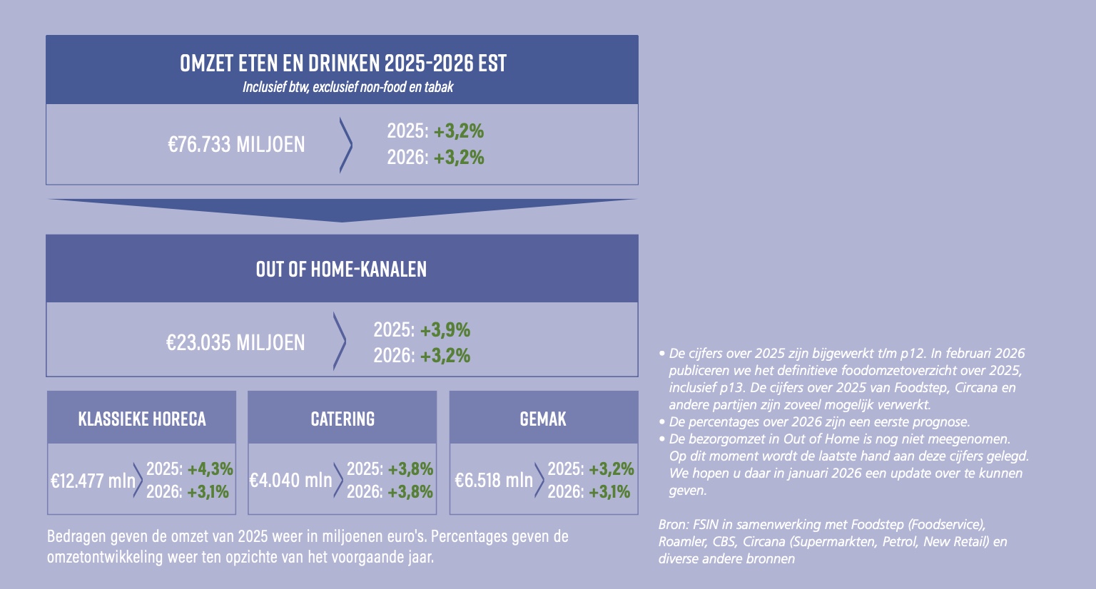 De Nederlandse out-of-homemarkt liet in 2025 een omzetgroei van 3,9% zien tot €23 miljard. Dat blijkt uit nieuwe marktcijfers van het FoodService Instituut Nederland (FSIN), gepresenteerd tijdens de Horecava. De groei werd gedragen door een lichte volumetoename, maar winstmarges staan structureel onder druk door hoge personeels- en inkoopkosten. Voor 2026 verwacht FSIN een verdere groei van 3,2% naar €23,7 miljard, gesteund door dalende inflatie, stijgende koopkracht en een voorzichtig herstel van het consumentenvertrouwen. Binnen de verschillende kanalen zijn duidelijke verschillen zichtbaar: de klassieke horeca groeit door naar €12,5 miljard, catering is met €4 miljard terug op pre-coronaniveau en in het fastservicekanaal blijft volumegroei achter, waardoor prijsperceptie daar een strategisch aandachtspunt wordt. De sector staat voor de uitdaging om groei om te zetten in duurzame rendementen.