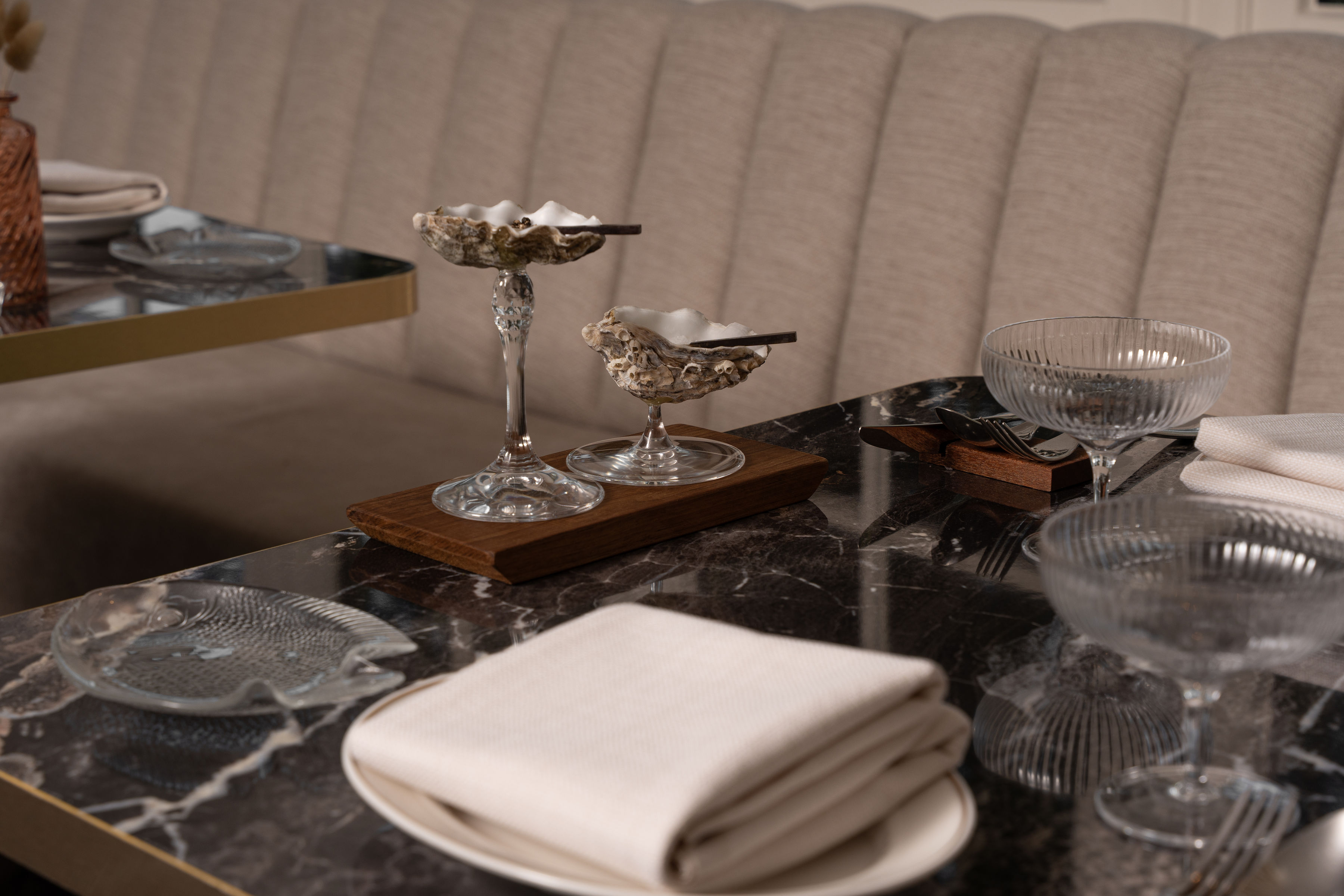 Venhorst vervolgt. “Alles wat we hebben geleerd in de topgastronomie, passen we hier toe, maar wel passend in ons eigen concept.” In de praktijk houdt dat in: minder handelingen op het bord, maar wel alles huisgemaakt, van de soepen en sauzen tot het brood en ijs. Bouchot telt dertig couverts en draait één shift per lunch of diner. Er ligt geen linnen op de tafels en gasten mogen zelf hun tafelwater bijschenken.