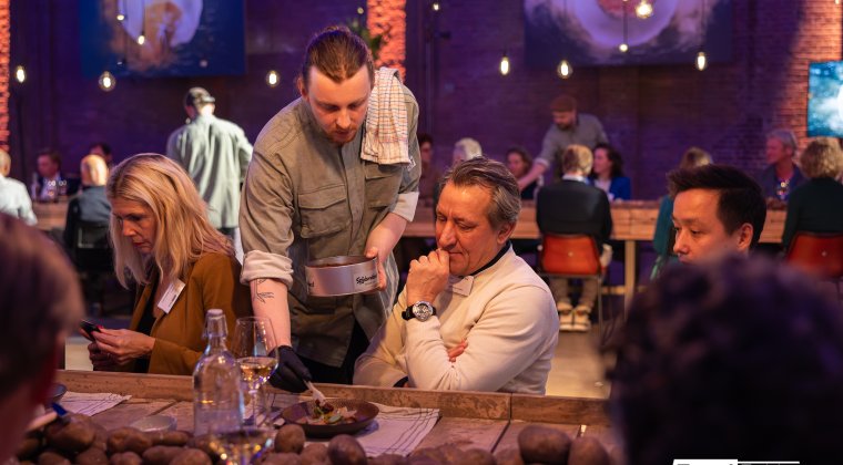 Het dessert bestond uit een taartje van pastinaak en witte chocolade met drie componenten, die de gasten zelf naar eigen wens konden afmaken met drie soorten compote: wortel, selderij met groene appel en biet en roos. "Om mooie dingen te bereiken, heb je samenwerkingen nodig. We hebben de basis staat voor het desert, en dat mogen jullie samen gaan afmaken. Dat vraagt om nieuw leiderschap aan tafel."