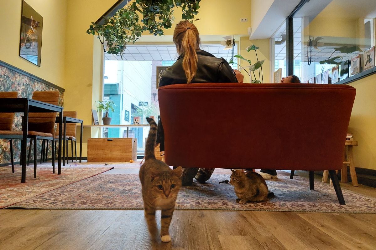 Voor de een is het de hel, voor de ander de hemel: het kattencafé. Er zijn er zo’n 16 in Nederland en een daarvan bevindt zich in Arnhem: kattencafé de Muis. Hier drink je koffie of eet je een broodje terwijl een van de acht katten gezellig op je schoot komt liggen. De binnentuin van het kattencafé is een rustige oase in de drukte van de stad.