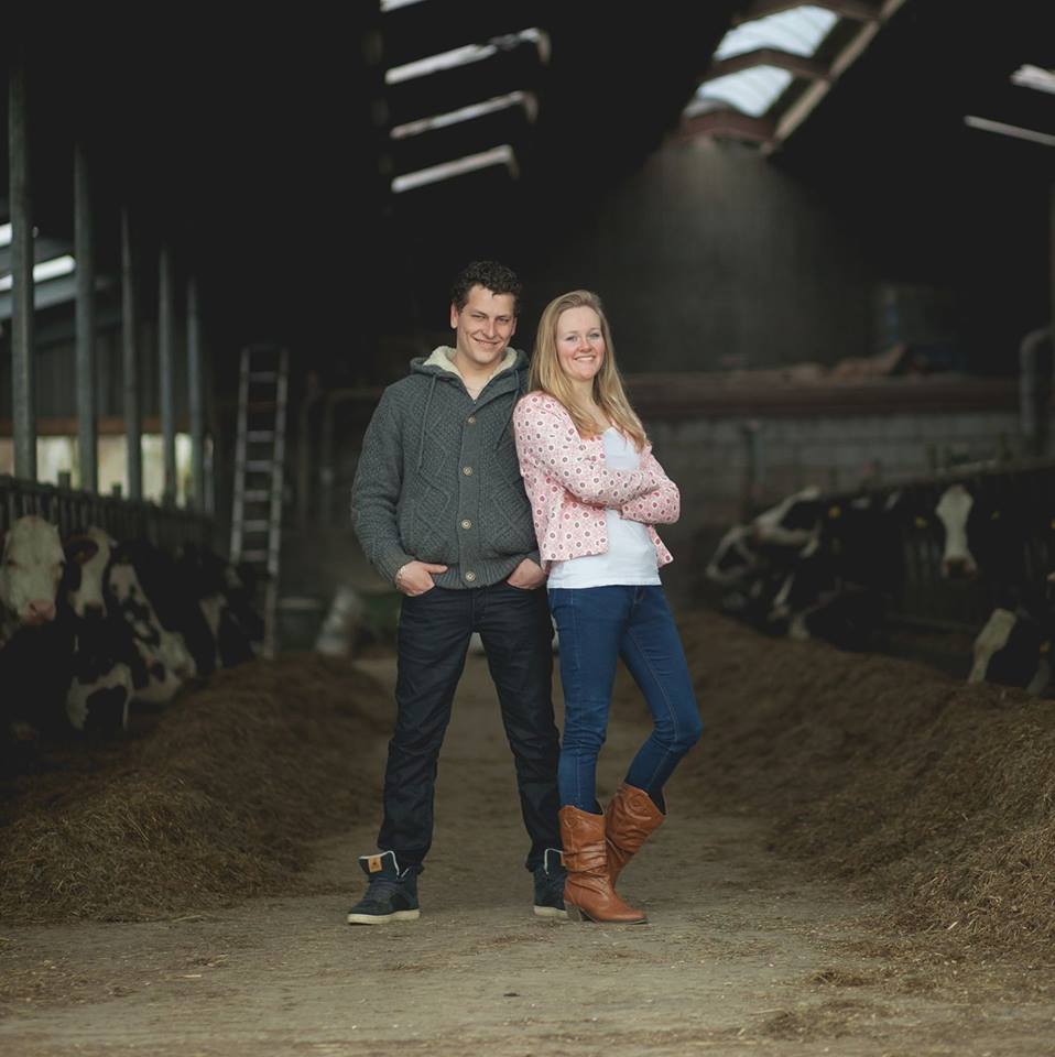 Op de foto: Kirsten en haar vriend in een van de stallen van Kaasboerderij De Buitenhoeve.