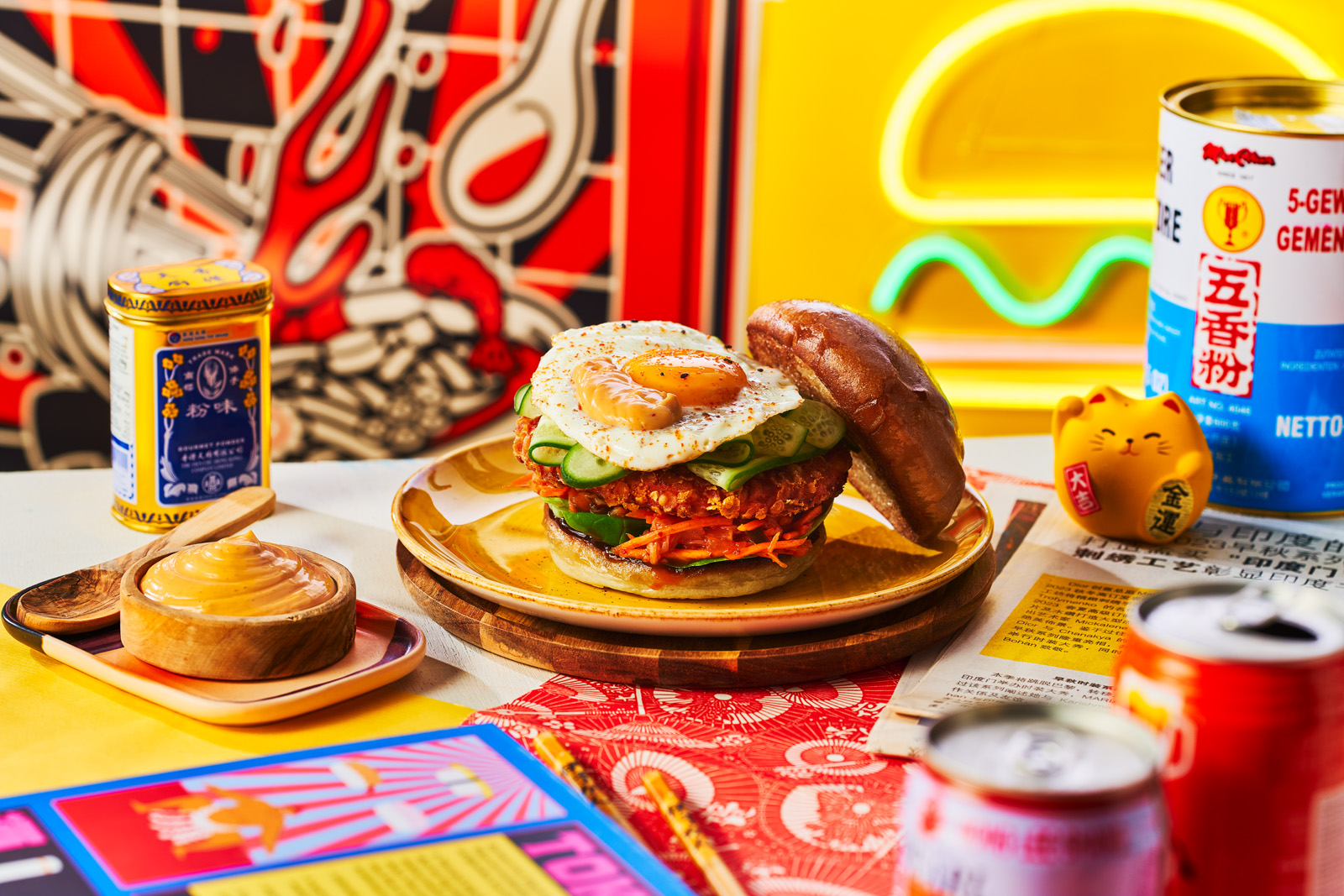 Bak de krokante kipburgers goudbruin en laat goed uitlekken. Verhit een koekenpan en bak vier spiegeleieren. Bestrooi met togarashi kruiden.