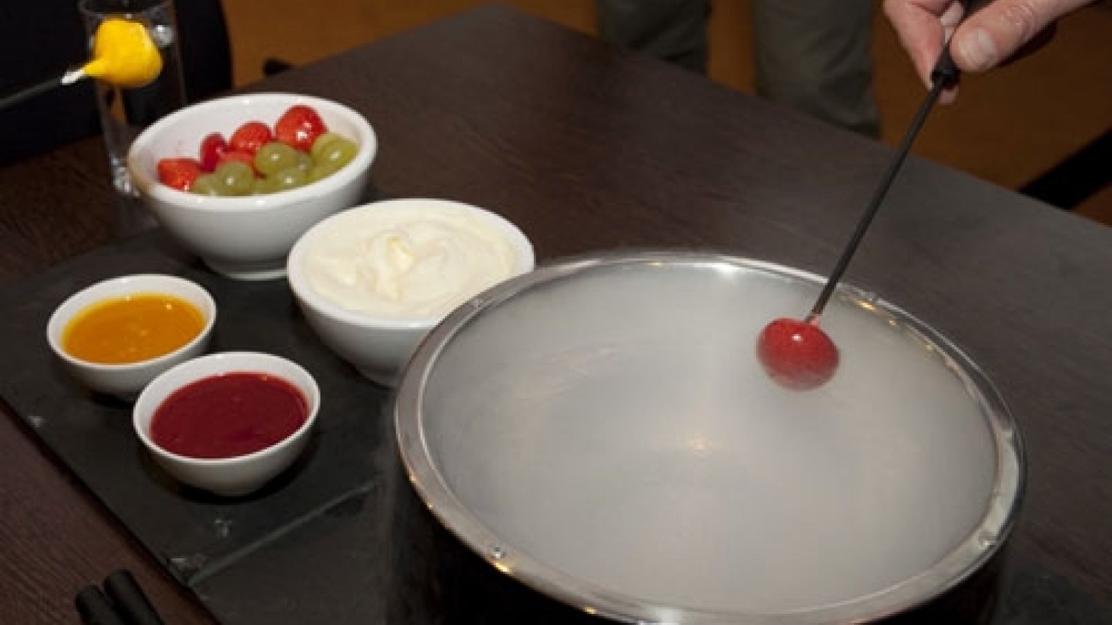 De fonduestelletjes aan tafel houden fruitstukjes op hun fonduevork 5 seconden in een ijskoude dip van fruitsap of chocolade en ervaren daarna een smaakexplosie.