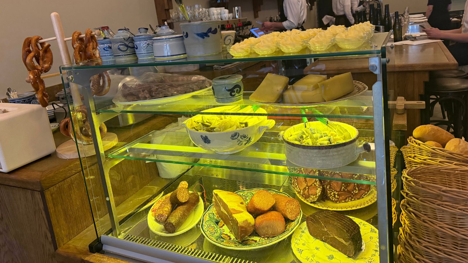 De Jong gaat voor zijn aufschnitt-station verder dan de standaardworsten. “Duitsland heeft een waanzinnige traditie in vleeswaren die we hier nauwelijks kennen”, vertelt hij. “In de vitrine liggen specialiteiten, zoals de metworst van Schinkenbrauerei Braasch uit Noord-Duitsland, een familiebedrijf dat al generaties lang op ambachtelijke wijze rookt in een klassieke rookhut. Ook heb ik verschillende soorten bloedworst gekozen, zoals tongenworst, en verfijnde hammen die specifiek zijn geselecteerd op hun rijping en vetmarmering.” Gasten kunnen de vleeswaren per 50 gram bestellen, waardoor de drempel laag is om verschillende soorten te proeven.
