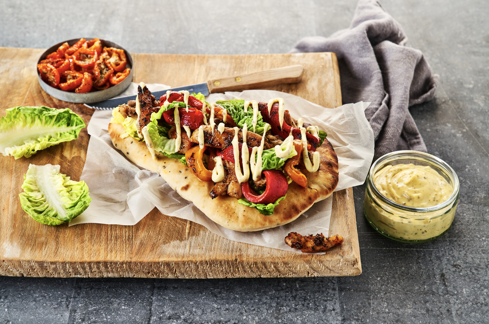 Bekijk hier het recept voor een flatbread met groene pesto mayonaise.